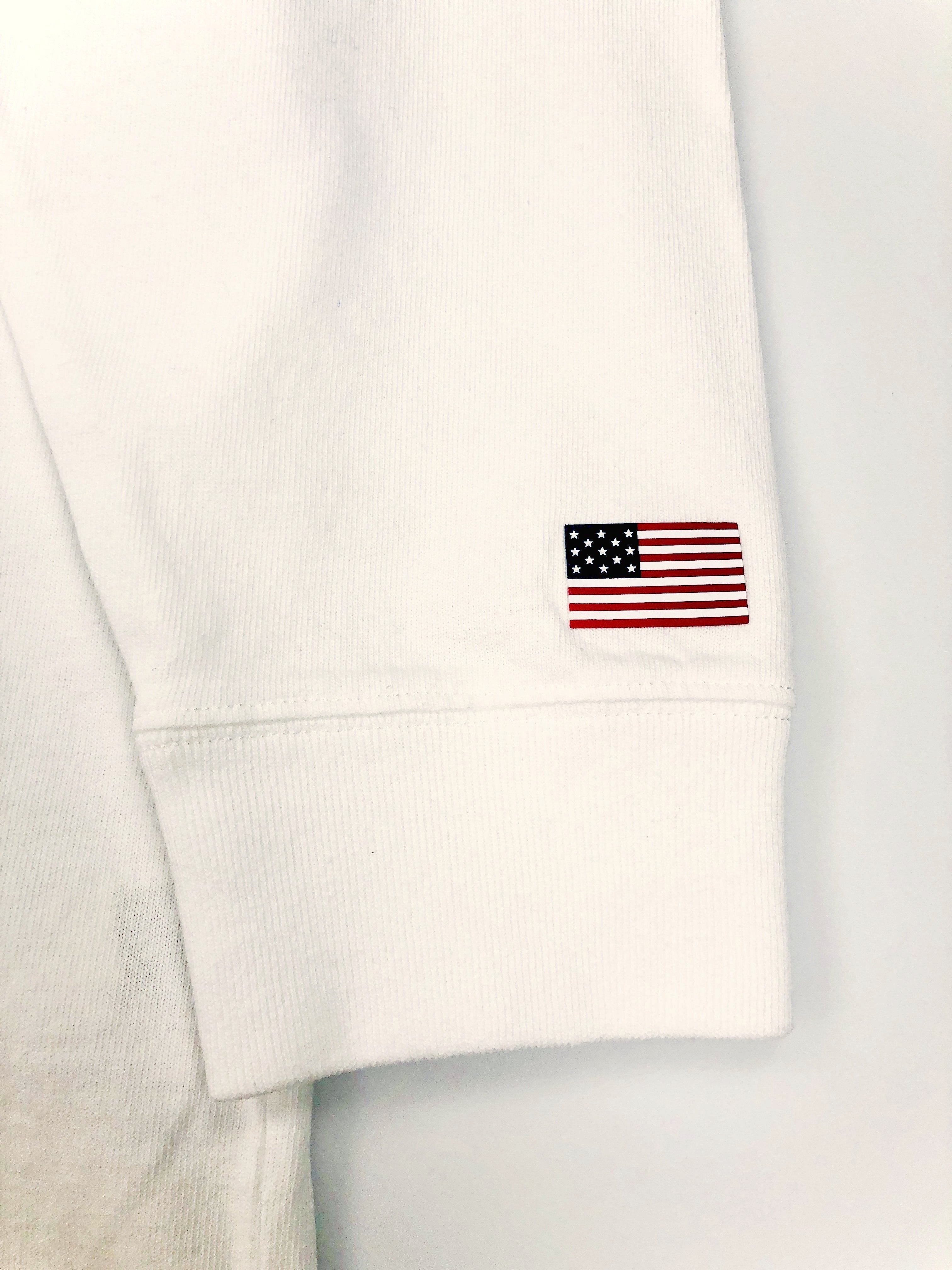 • Long sleeves with ribbed cuffs. Historical American flag printed at the left cuff. Ventilating embroidered eyelets at the underarms.