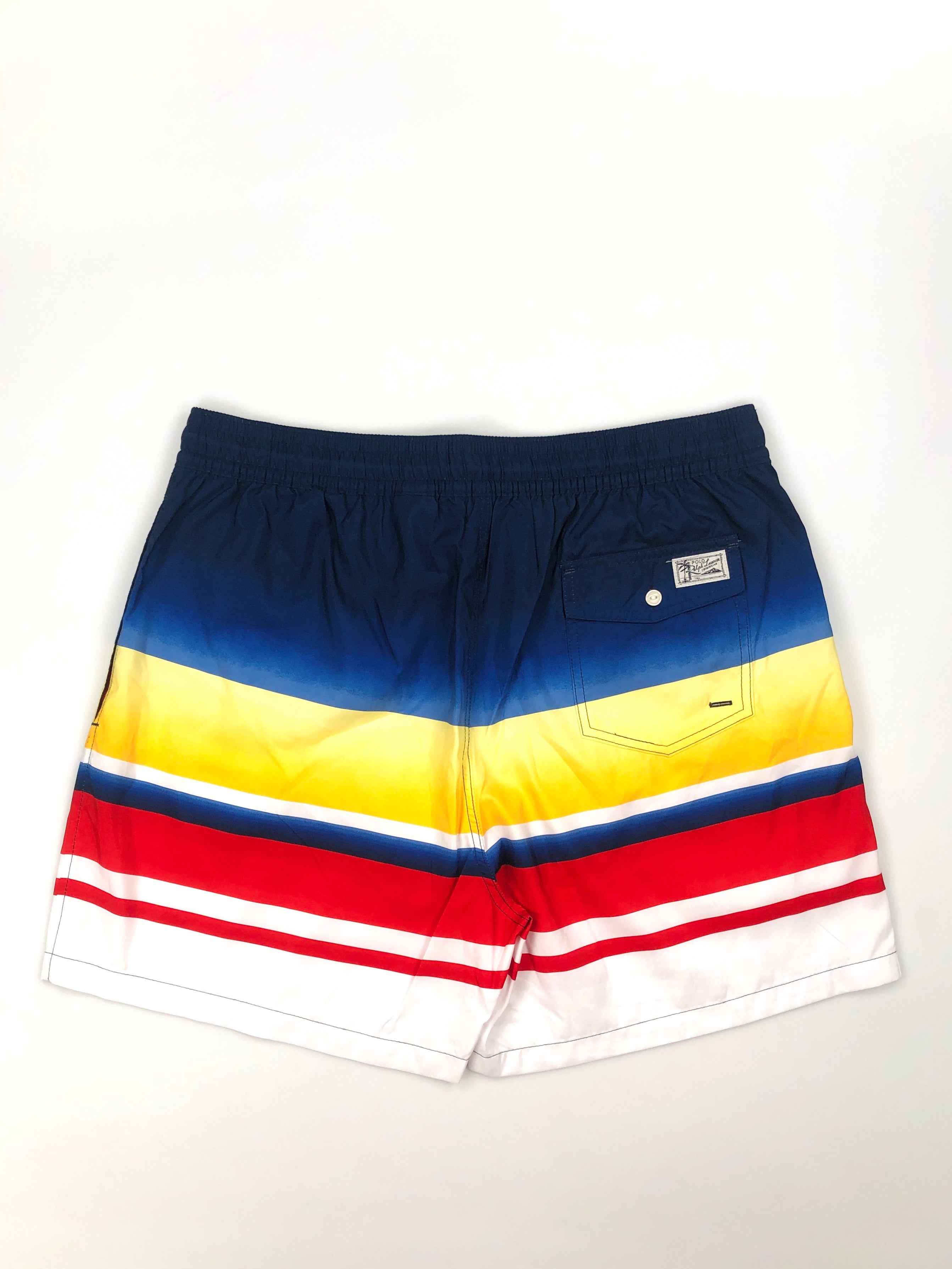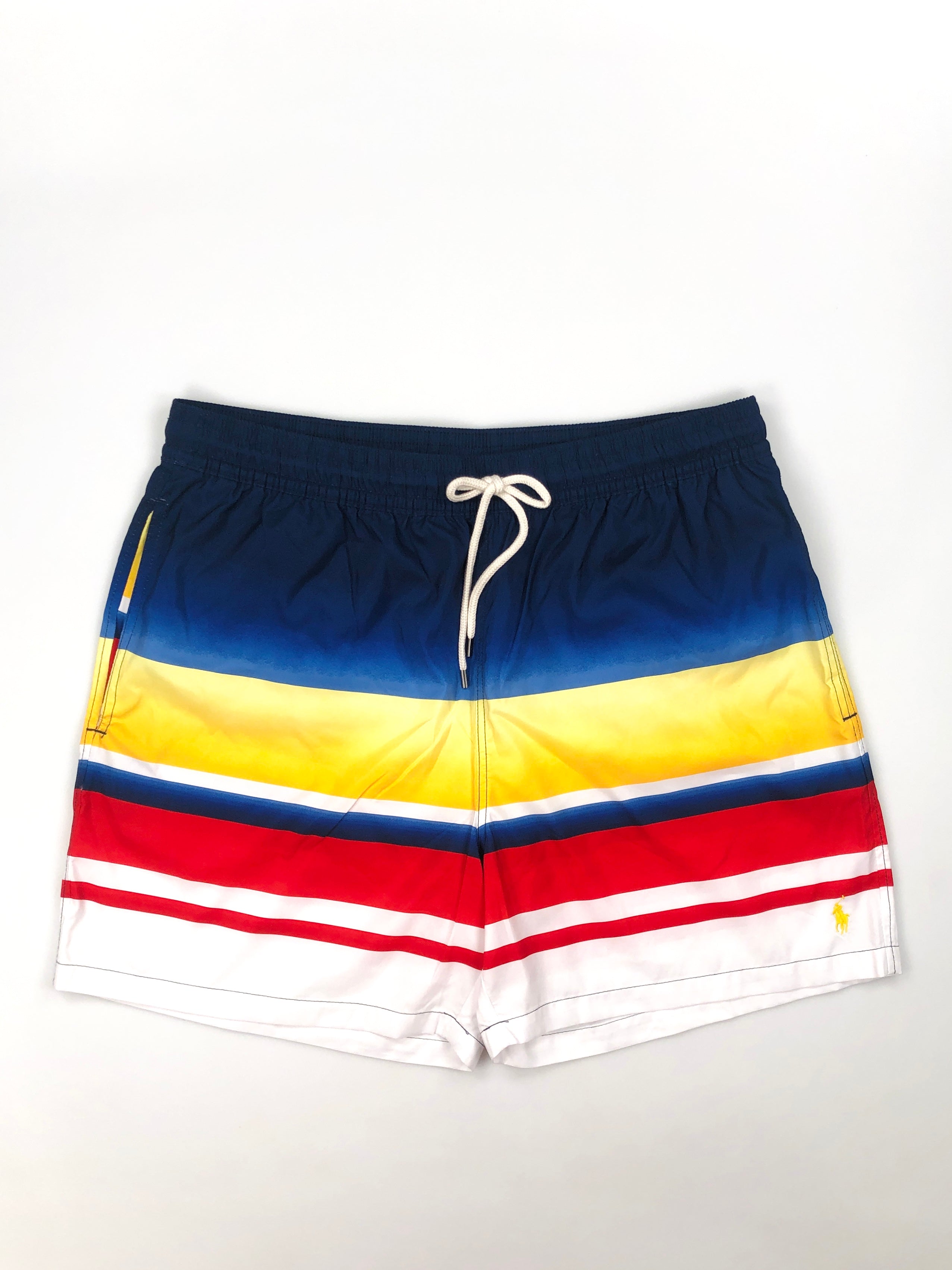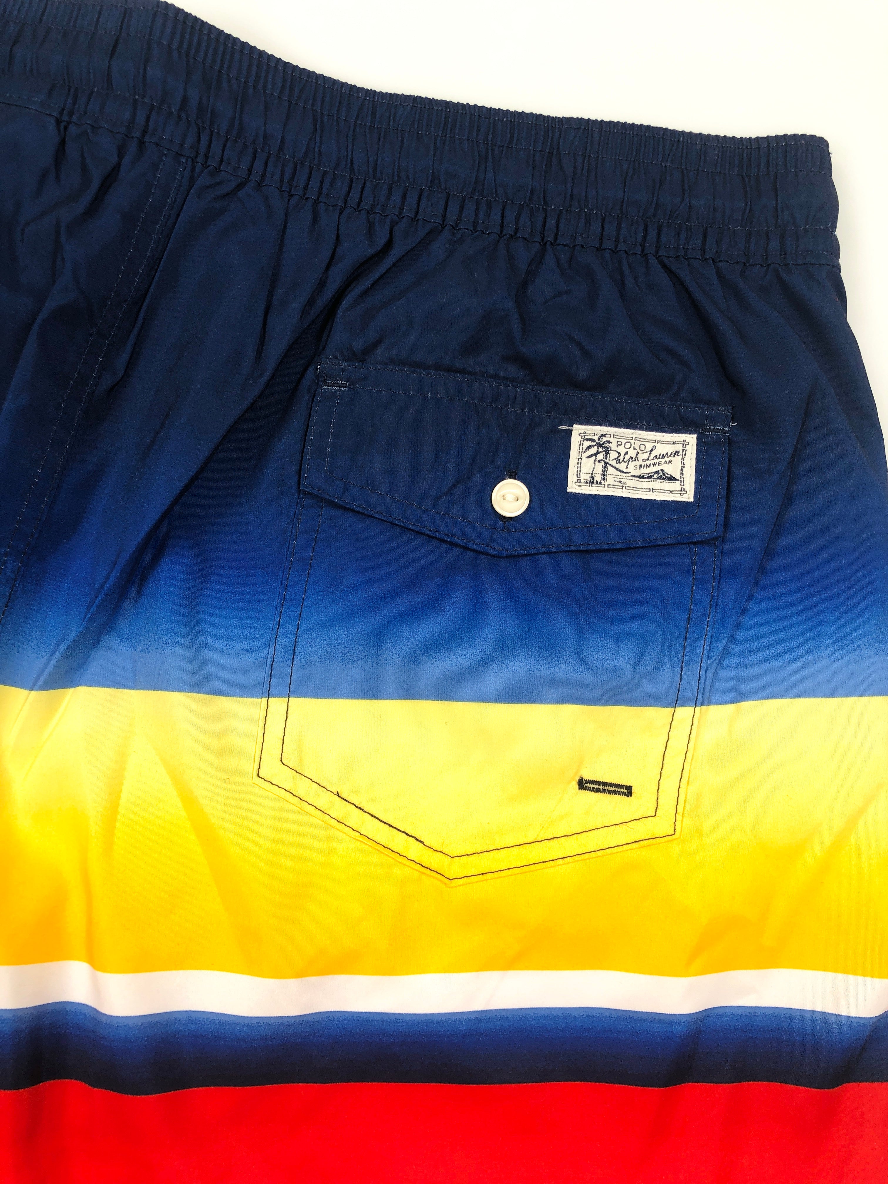 - Elastic drawstring waistband. Side on-seam pockets. Back right buttoned pocket with a "Polo Ralph Lauren Swimwear" label.