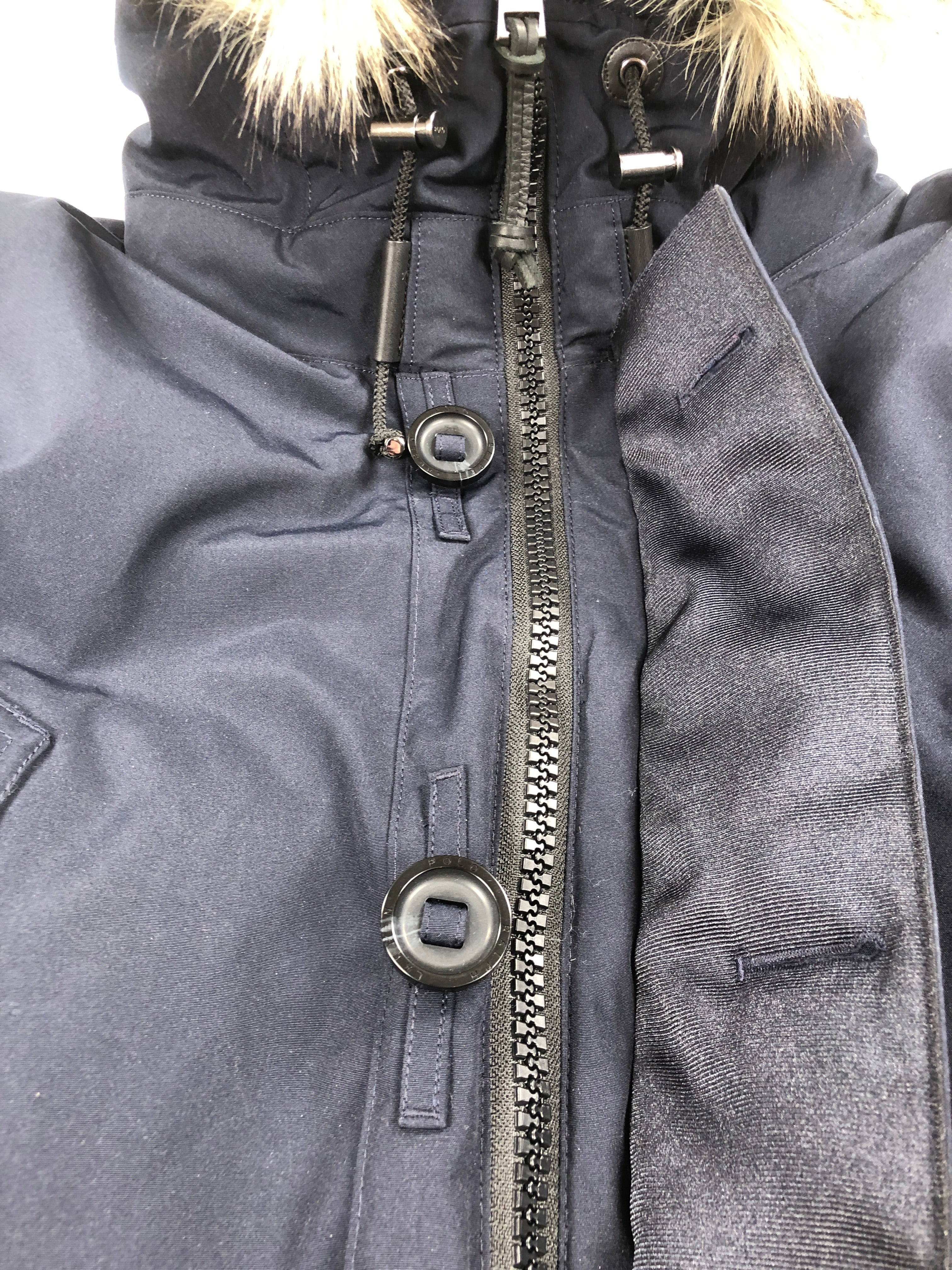 • Drawstring hood with a buckled tab at the back and snap-off faux-fur trim. Full-zip front. Leather zipper pull. Buttoned storm placket.
