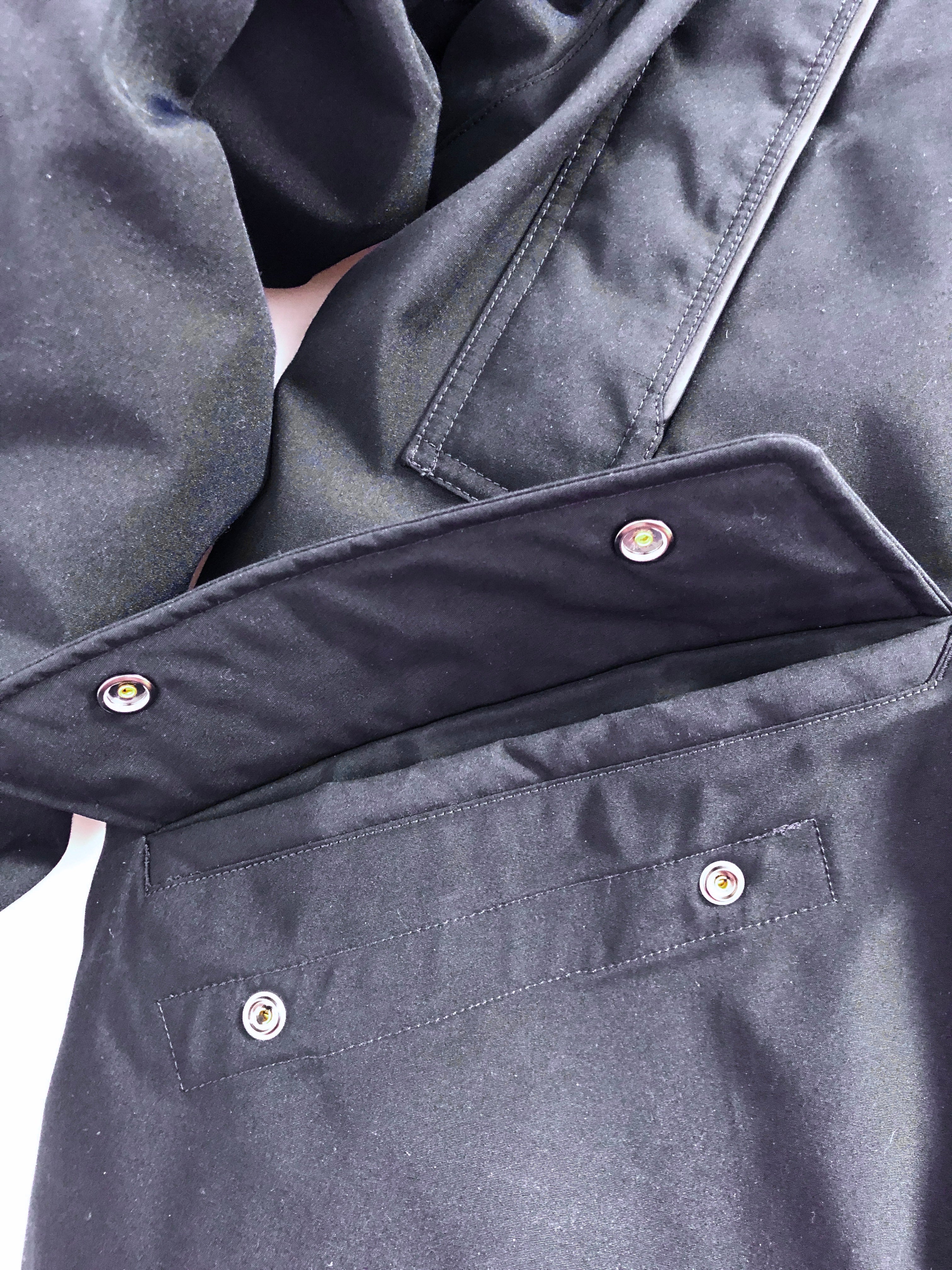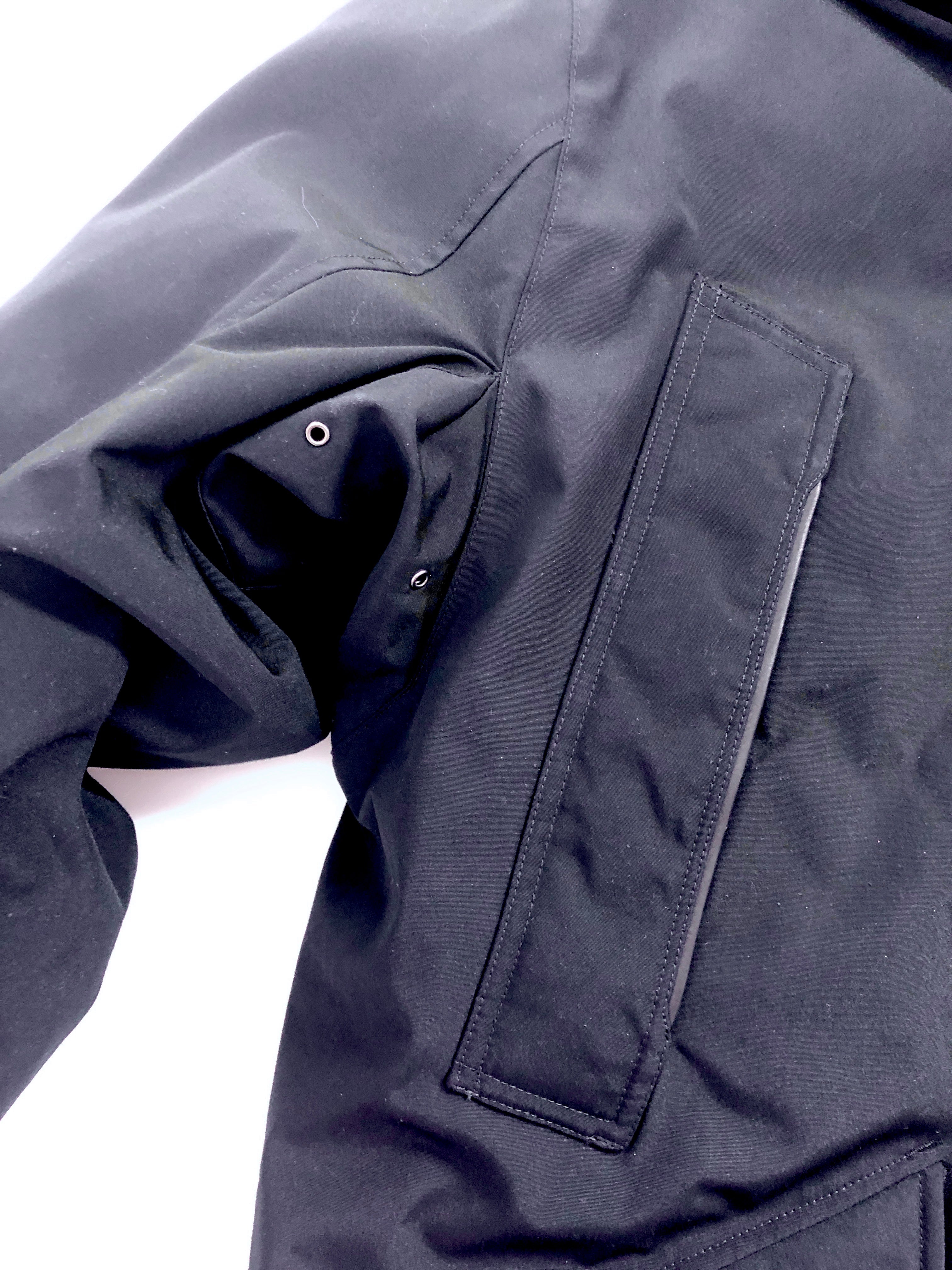 • Long sleeves. Adjustable snapped tabs at the cuffs. Interior ribbed cuffs. Ventilating metal grommets at the underarms.