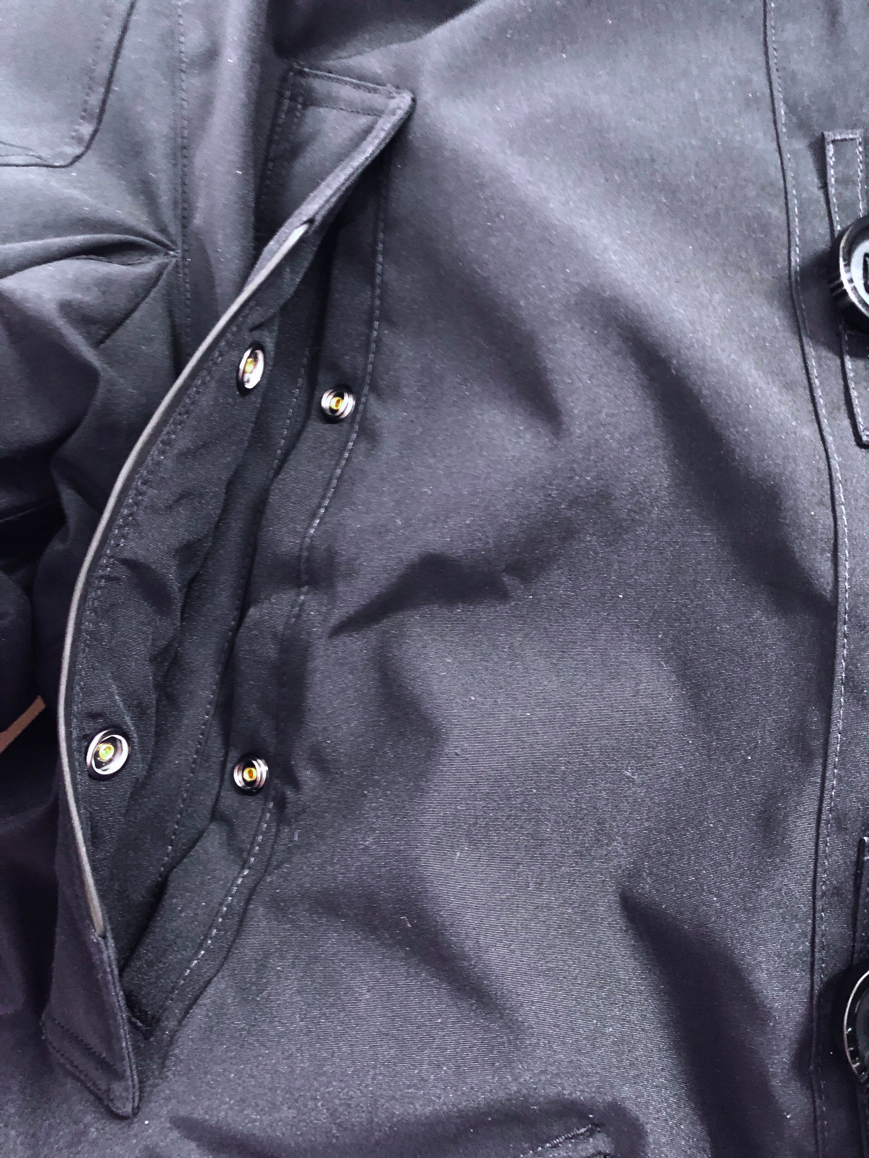 • Two chest snapped pockets. Two front waist snapped pockets. Interior left chest pocket. Interior right waist pocket.