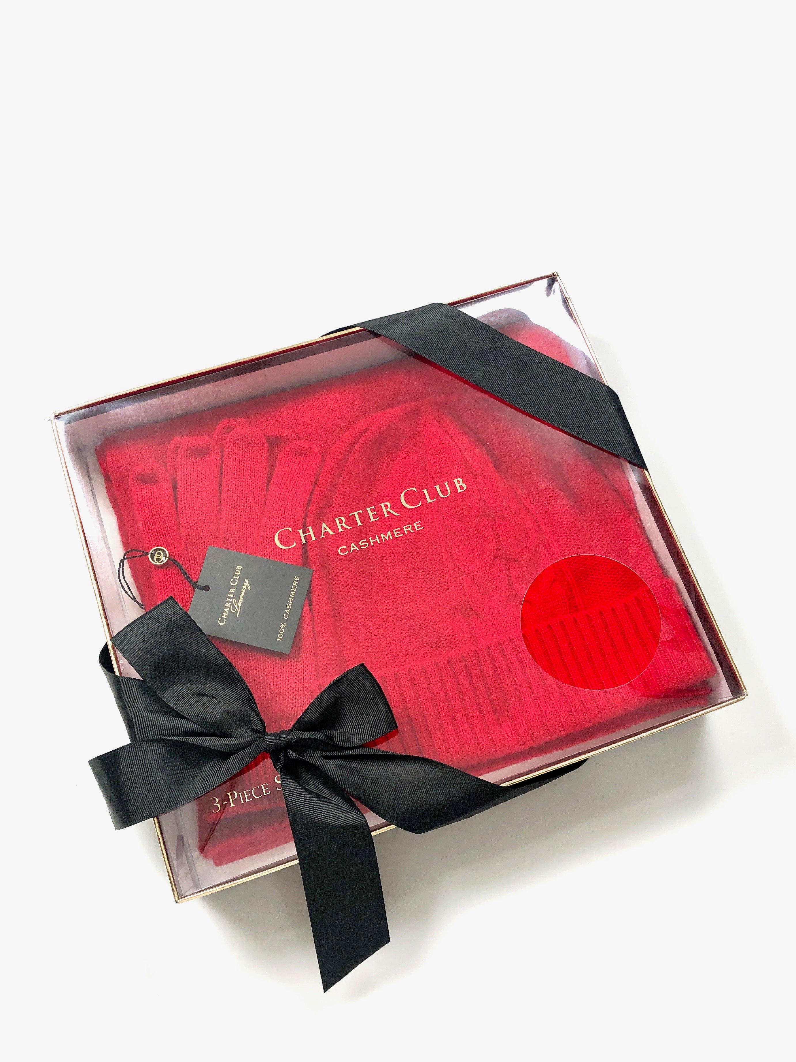 Give the gift of luxurious warmth and coziness with this super soft hat, gloves and scarf set from Charter Club, already boxed and tied with a bow.