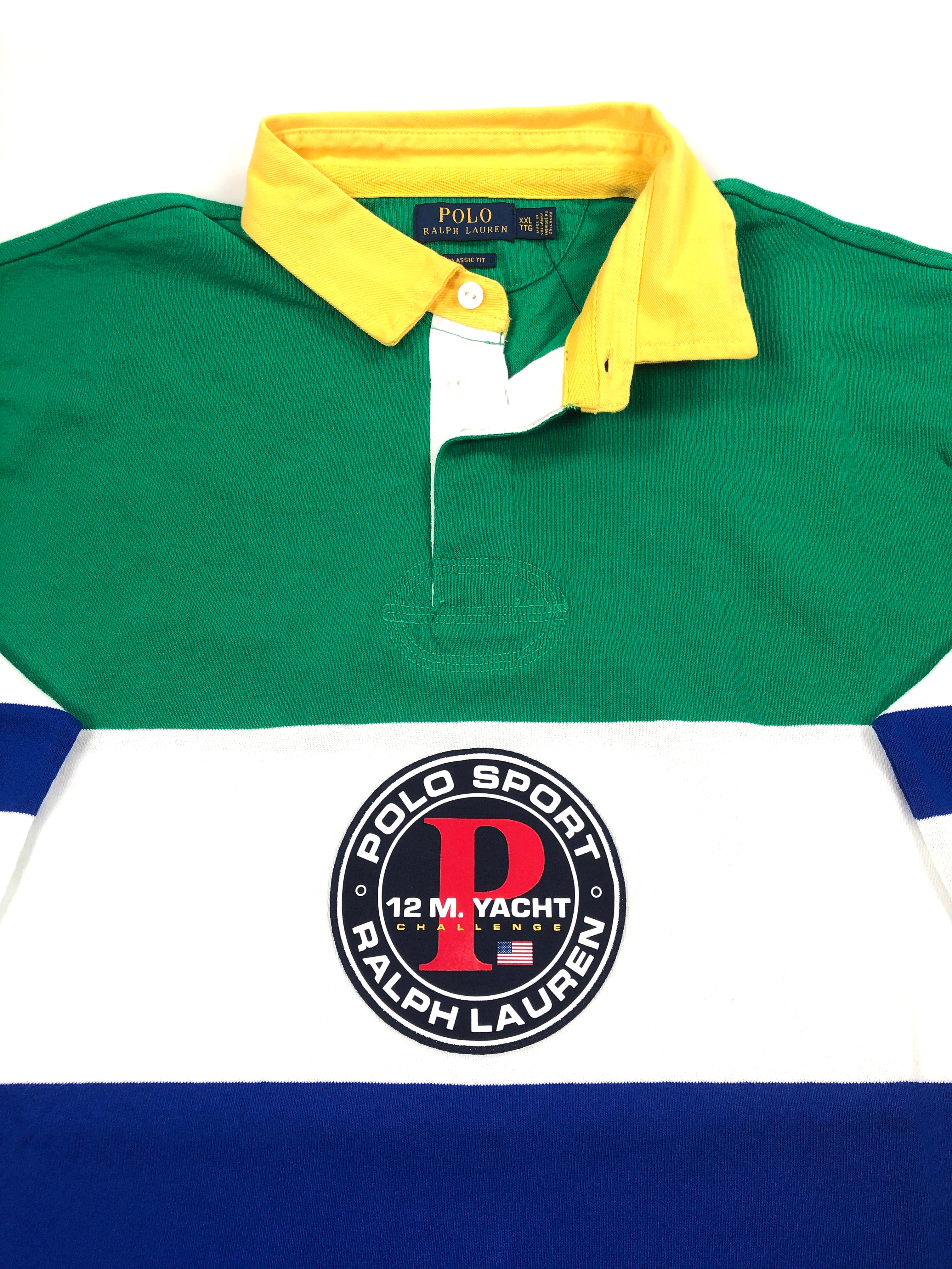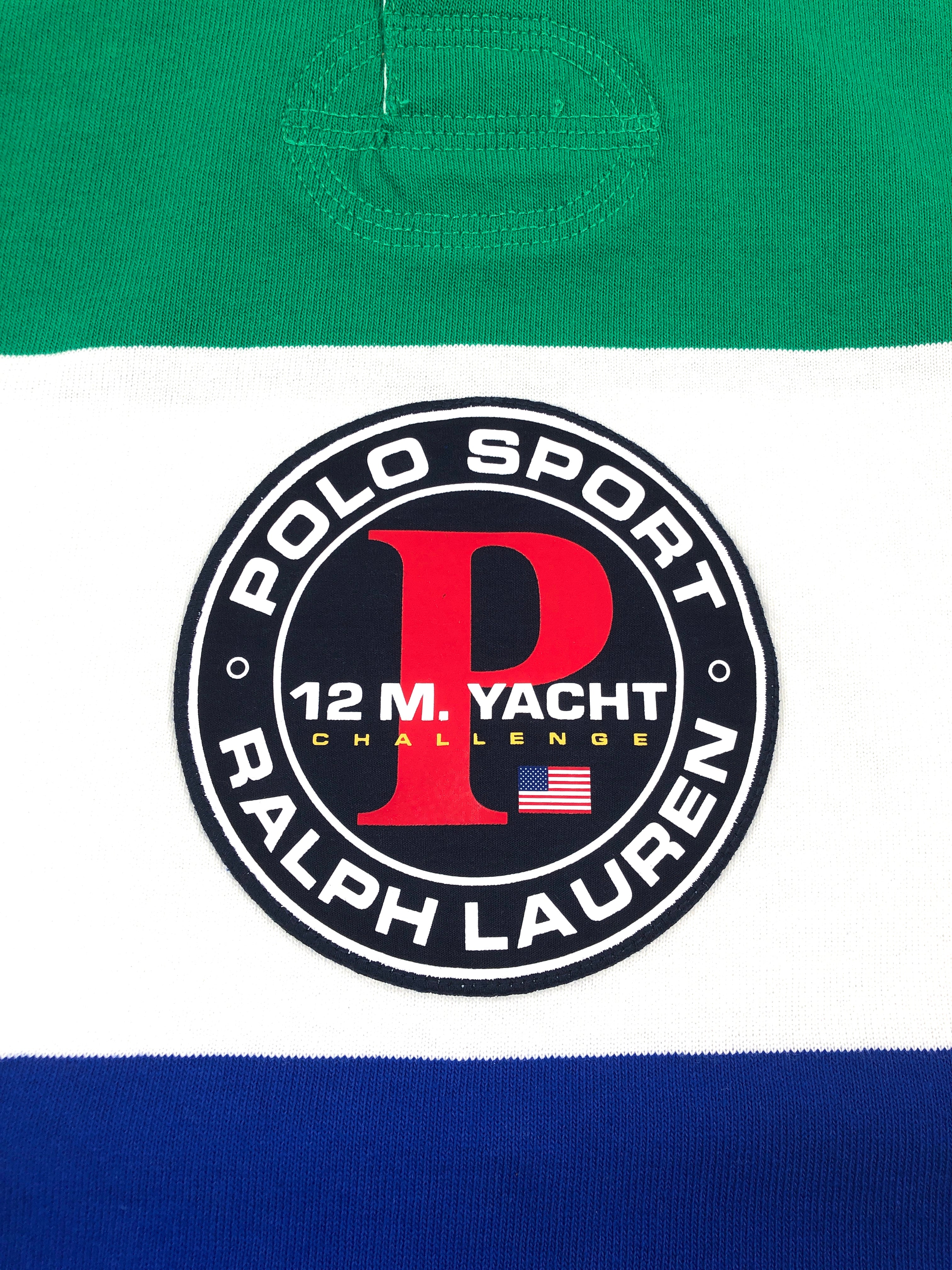 - Archival "Polo Sport P 12 M. Yacht Challenge Ralph Lauren" patch at the center front.